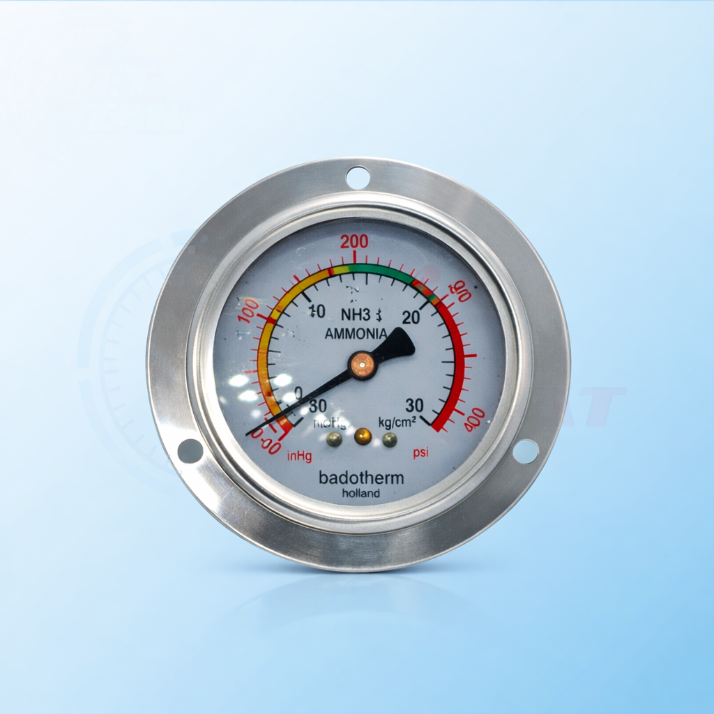 Đồng hồ đo áp suất NH3 cao áp thấp áp mặt 63mm chân sau ren 13mm, vỏ inox bền bỉ, hiển thị rõ áp suất và vùng an toàn gas amoniac. Phù hợp cho hệ thống lạnh NH3 công nghiệp, kho lạnh và chiller.