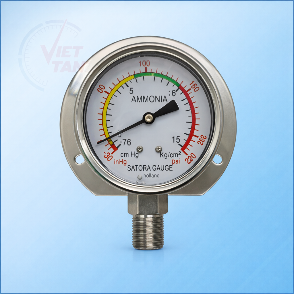 Đồng hồ đo áp suất NH3 amoniac mặt 75mm, chân đứng inox có pad gá chắc chắn, chuyên dùng cho hệ thống lạnh NH3. Sản phẩm hiển thị rõ ràng, chịu ăn mòn, độ chính xác cao.